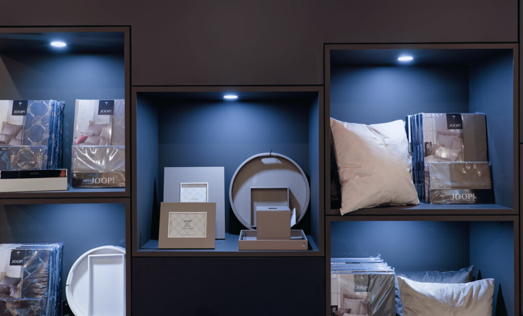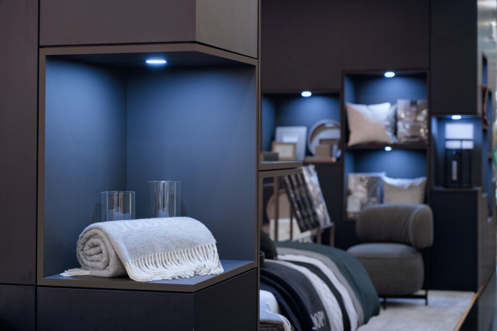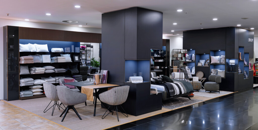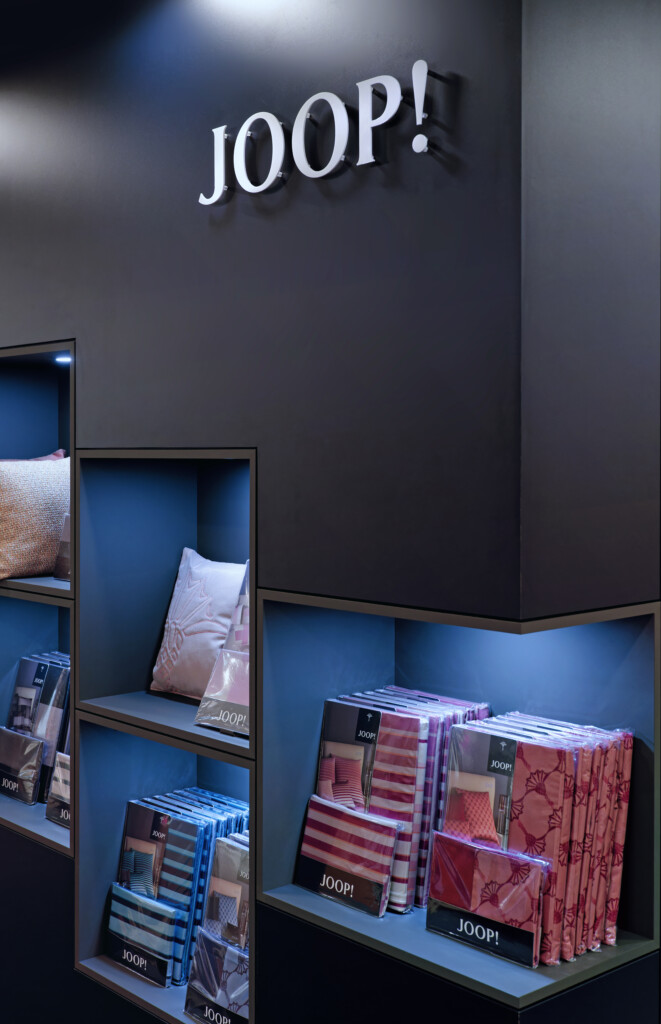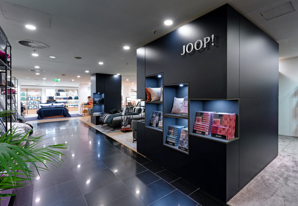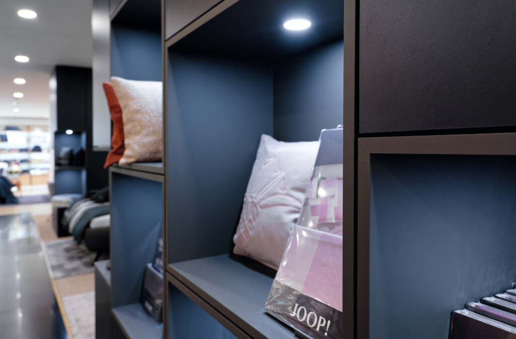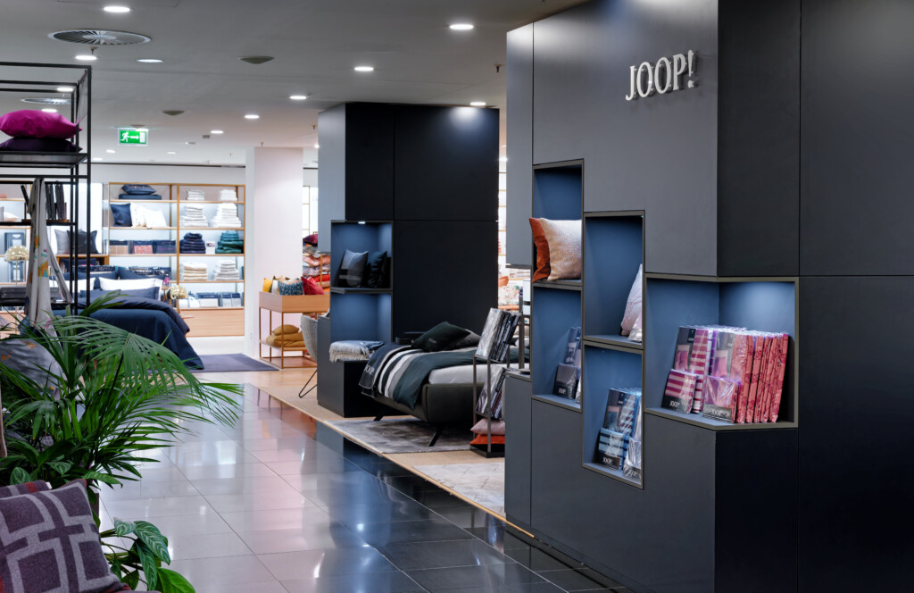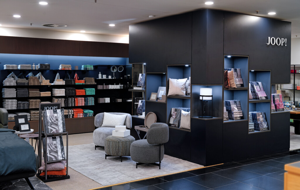 mann Objecta realisiert seit mehreren Jahren den Ladenbau für JOOP! Living an verschiedenen Standorten, darunter das Alster-Haus in Hamburg. Im Fokus steht dabei die Anpassung des modularen, standardisierten CI-Ladenbaus sowie der Warensortimentsträger an die jeweilige Flächensituation. JOOP! Living entwickelt hierfür individuelle Merchandising- und Produktplatzierungskonzepte, die in Abstimmung mit den Flächenbetreibern finalisiert werden. mann Objecta setzt diese Vorgaben technisch um, wobei Aspekte wie Deckenhöhen, Licht- und Wandsituationen, Bodenflächen, Verkehrswege sowie Brandschutz berücksichtigt werden. Eine besondere Herausforderung stellte die vollständige Einhausung zweier statischer Stützen mittels einer Sonderlösung dar, die in einem hochwertigen Ladenbau umgesetzt wurde.