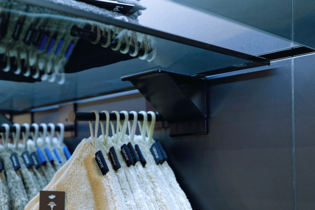 Die Integration des standardisierten CI-Programms von JOOP! Living mit seinen prägenden Gestaltungselementen erforderte einen umfangreichen Erfahrungsschatz und ein tiefes Verständnis der Kundenwünsche. Die Steuerung und Abstimmung dieser Anforderungen innerhalb des engen Zeitfensters und über alle beteiligten Parteien hinweg war ein wesentlicher Erfolgsfaktor. Besonderes Augenmerk lag auf der Ausarbeitung der Produktnischen in den Säulenumbauungen, deren maßliche Dimensionierung sowie der Hervorhebung durch matt ausgeführte Oberflächen, feine Fügungen und gezielte Lichtinszenierung.