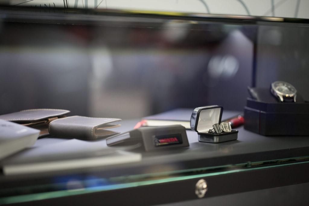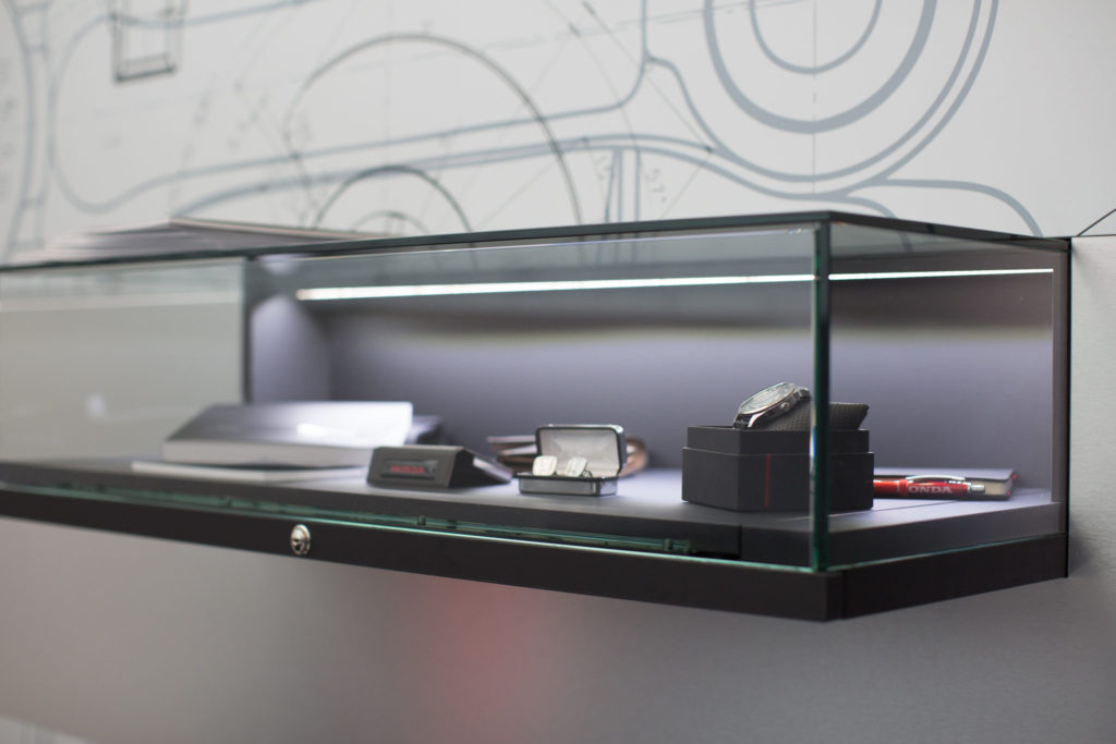 Die Wandgestaltung im Rauminneren ist in gebürsteter Edelstahl-Optik gehalten und mit quer verlaufenden Dekorflächen versehen, die hochskalierte Bauteilzeichnungen zeigen. Eine gradlinige Glasvitrine dient der Präsentation edler Schmuck-, Uhren- und Lederaccessoires und unterstreicht das exklusive Ambiente.