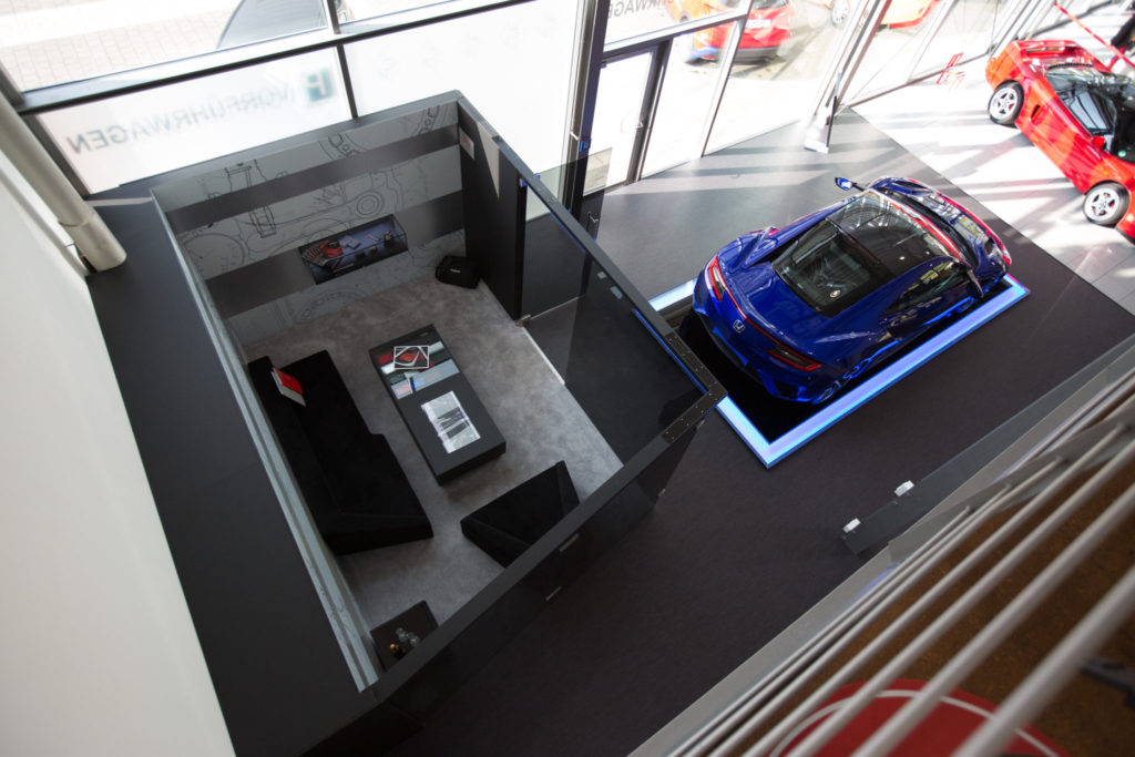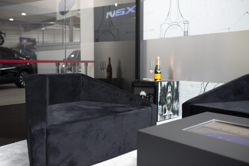 In unmittelbarer Nähe des Fahrzeugs hat mann Objecta einen abgetrennten Raum mit wohnlicher Atmosphäre geschaffen, der sowohl als Loungebereich für Kundinnen und Kunden als auch als Beratungsraum genutzt werden kann. Die graue Teilverglasung ermöglicht einen ungehinderten Blick auf den NSX und schafft zugleich eine diskrete Privatsphäre. An der schwarzen Außenseite der Abtrennung ist ein Leuchtpanel mit dem NSX-Logo angebracht, das parallel zur Beleuchtung des Podests betrieben wird.