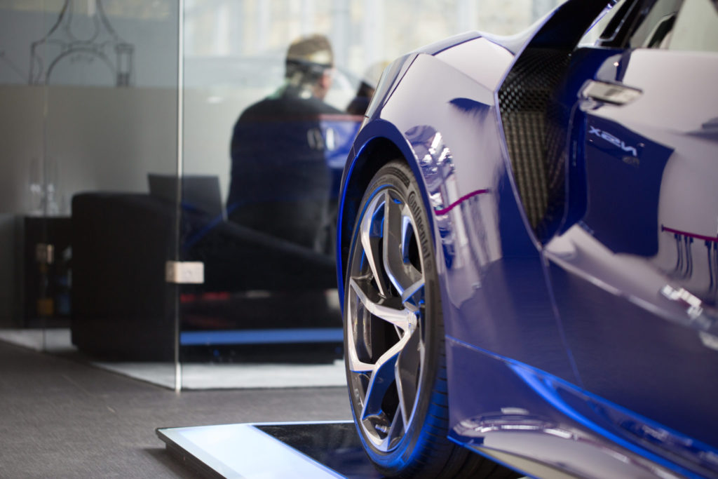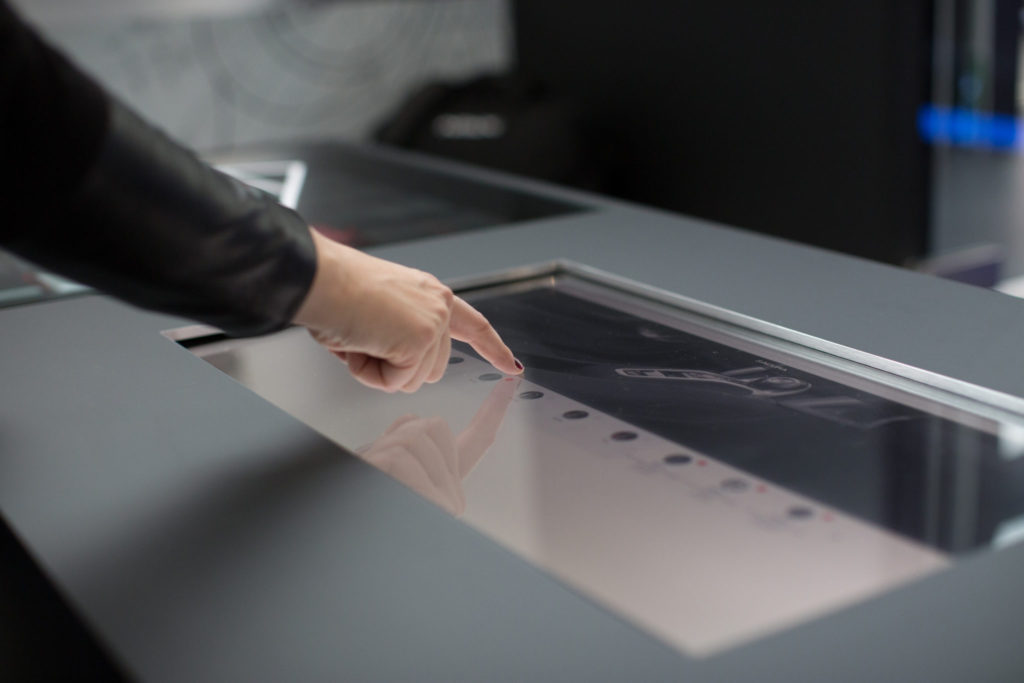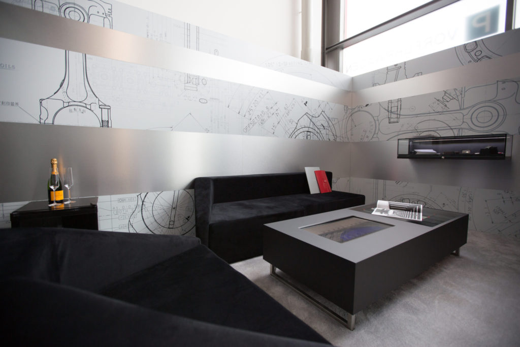 Im Inneren des Raumes lädt eine stilvolle Couchgruppe mit anthrazitgrauem Velourstoff zum Verweilen ein. Ein Loungetisch mit integriertem Touch-Panel-Monitor ermöglicht es, sich menügesteuert über technische Details zu informieren und Fahrzeugkonfigurationen vorzunehmen. Ergänzt wird das Angebot durch die Präsentation hochwertiger Lack- und Ledermuster, die durch eine eingelassene Glasscheibe sichtbar sind und über eine seitliche Schublade zugänglich gemacht werden.