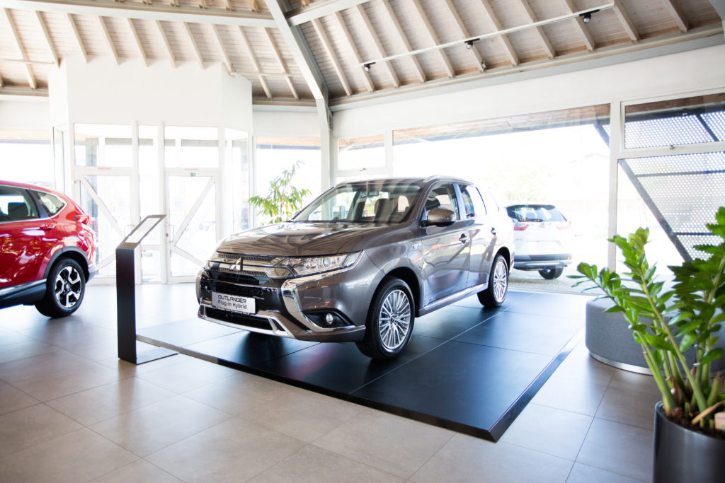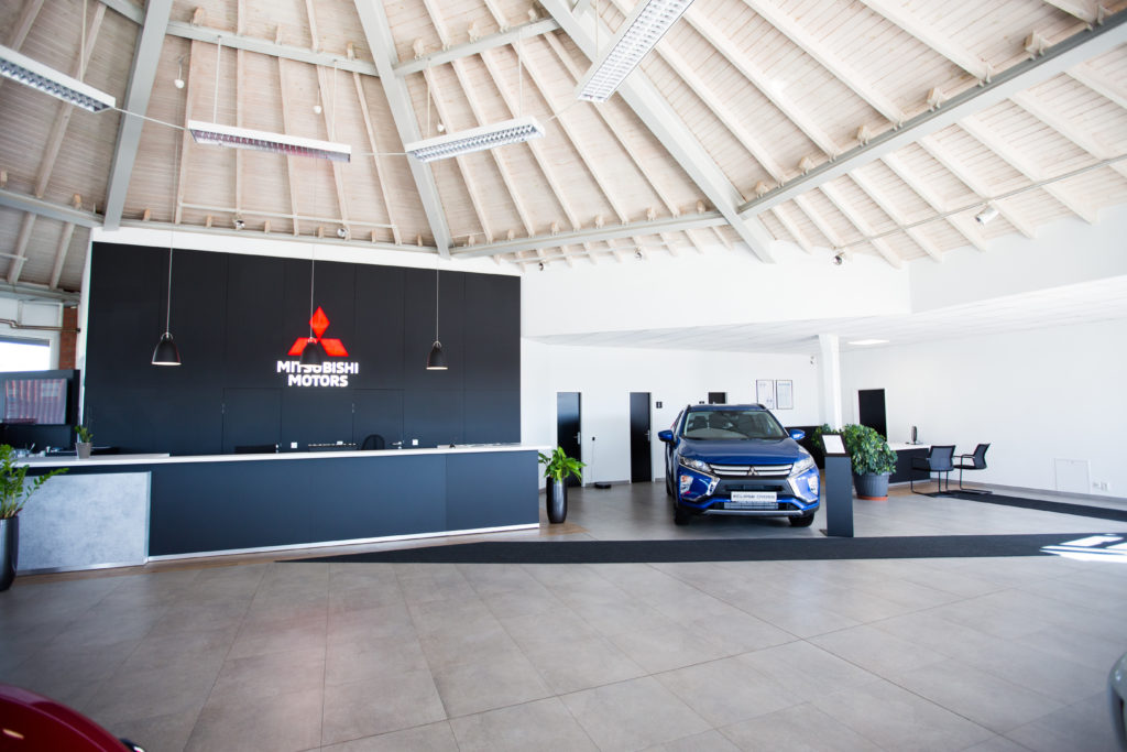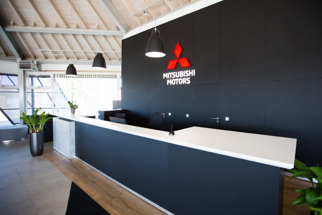 Im Jahr 2019 übernahm mann Objecta für Mitsubishi Motors Deutschland die Produktion, Lieferung und Endmontage der CI-konformen Möbel vor Ort. Die Möblierung orientiert sich konsequent an den Corporate-Identity-Vorgaben von Mitsubishi und verwendet vorherrschend die Farben Schwarz, Weiß und Betongrau. Hinter der großzügigen Empfangstheke dominiert eine schwarze Brandwall, die das LED-beleuchtete Markenlogo wirkungsvoll in Szene setzt.