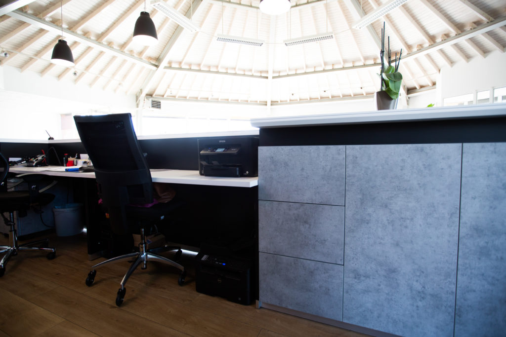 Im Verkaufsbereich ergänzen spezielle Technik- und Rollcontainer die Arbeitsplatztheken und ermöglichen eine optimale Unterbringung von Zubehör. Der Kundenloungebereich ist mit geradlinigen Sesseln in Grau und Schwarz sowie rund geformten Hockern ausgestattet. Ergänzend sind Highboards mit variierenden Höhen und unterschiedlichen Ordnermaßen Teil der Einrichtung.