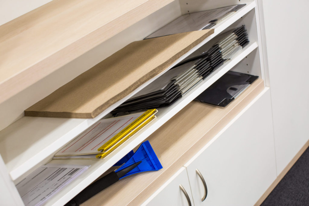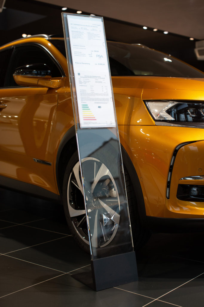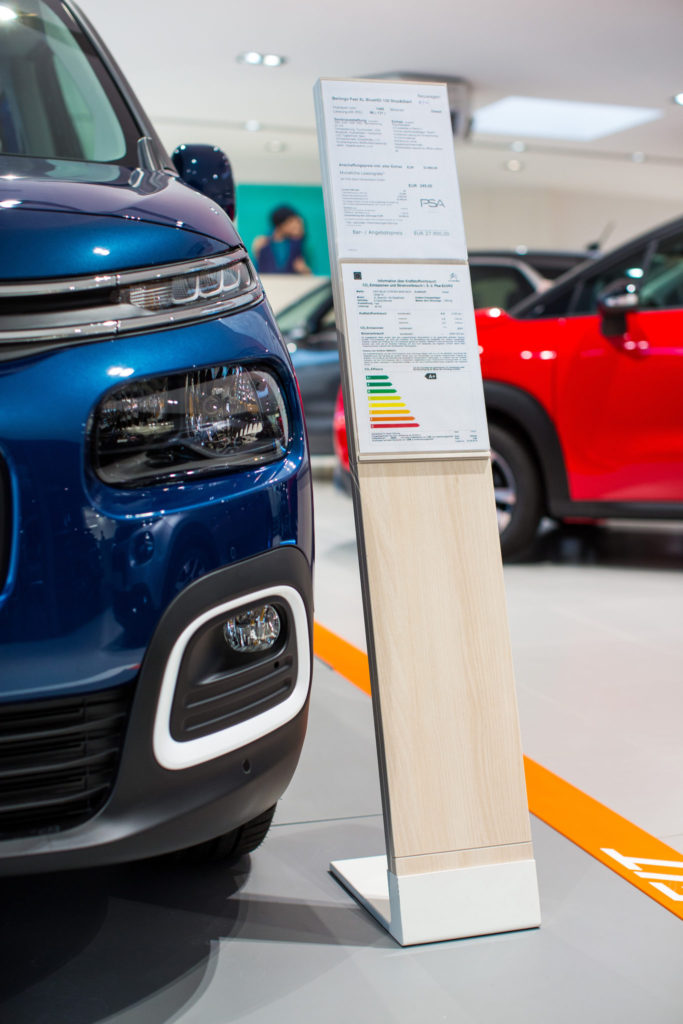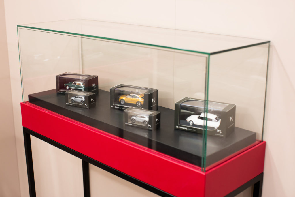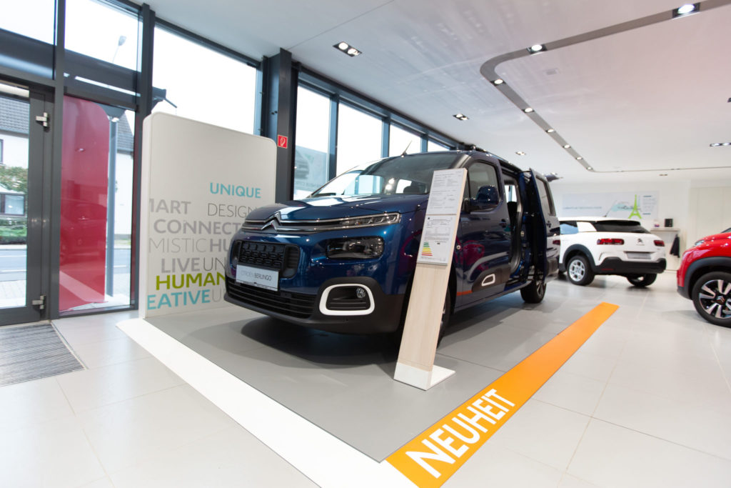 Besondere Merkmale sind die Fahrzeugpodeste mit integrierter LED-Beleuchtung sowie anthrazit-graue Komplettpodeste mit dezent ansteigenden Flanken. Diese setzen die ausgestellten Fahrzeuge wirkungsvoll in Szene und zeichnen sich durch ihre Wasserbeständigkeit sowie eine Konstruktion aus, die das Rangieren der Fahrzeuge nicht behindert. Ergänzt wird die Einrichtung durch hohe Konfigurationstische mit integrierten Informationsmonitoren, schlanke Preisaufsteller mit weißen Metallfüßen sowie variantenreiche Vitrinenunterschränke und TV-Schränke.