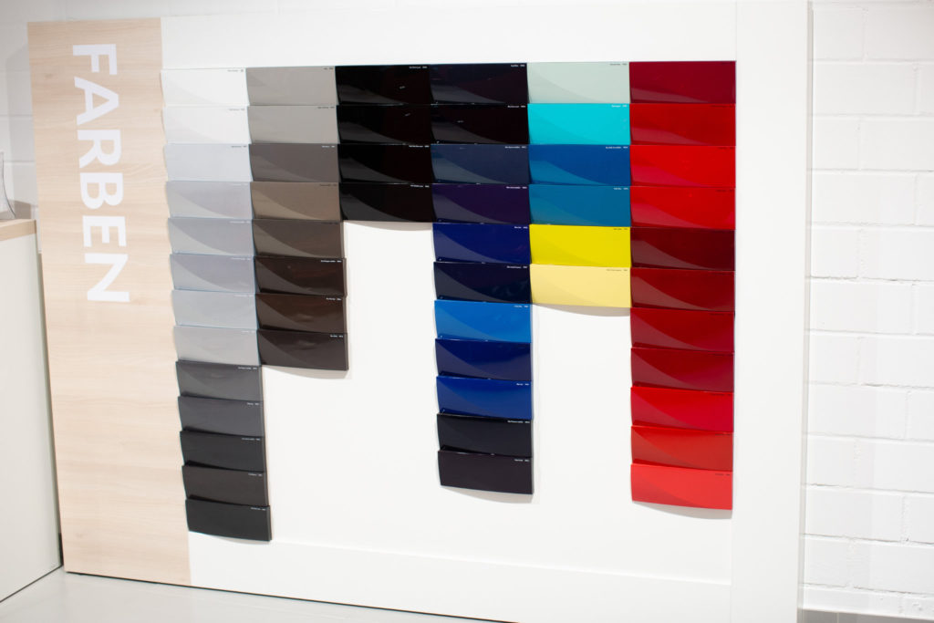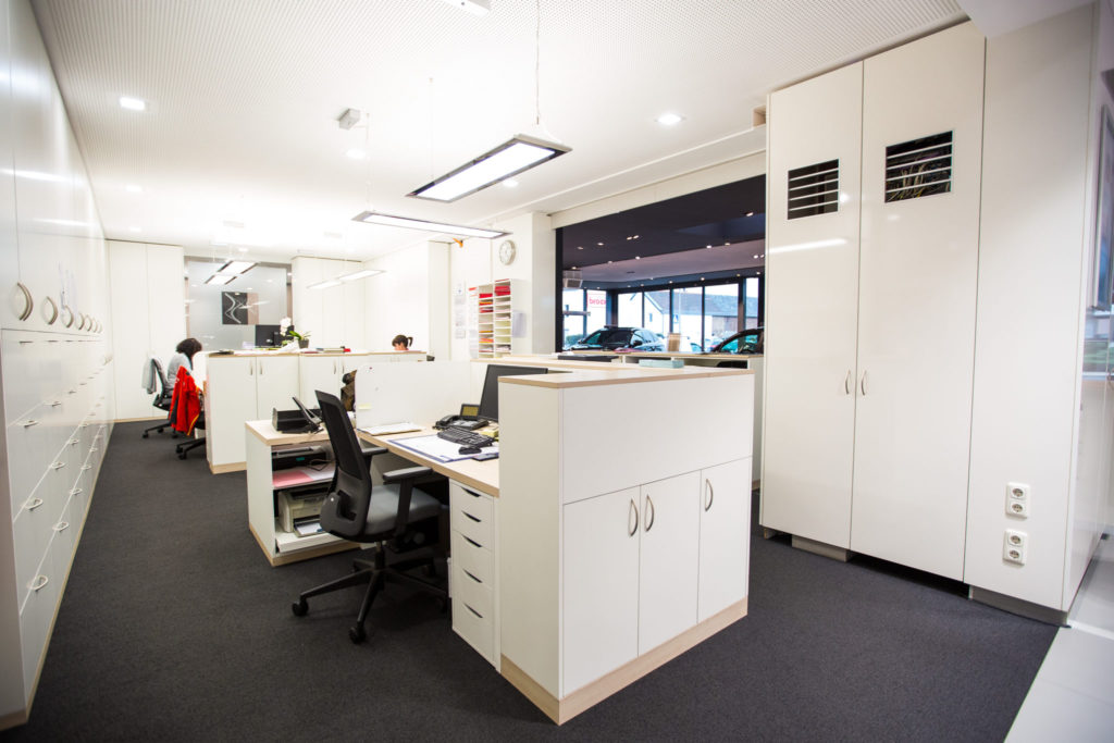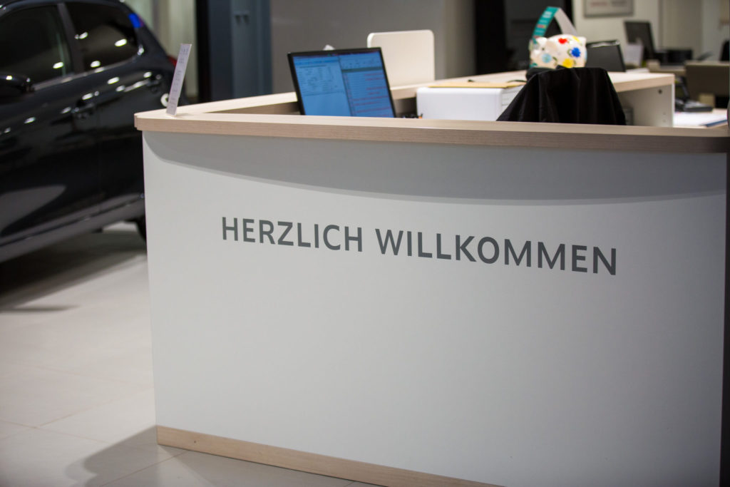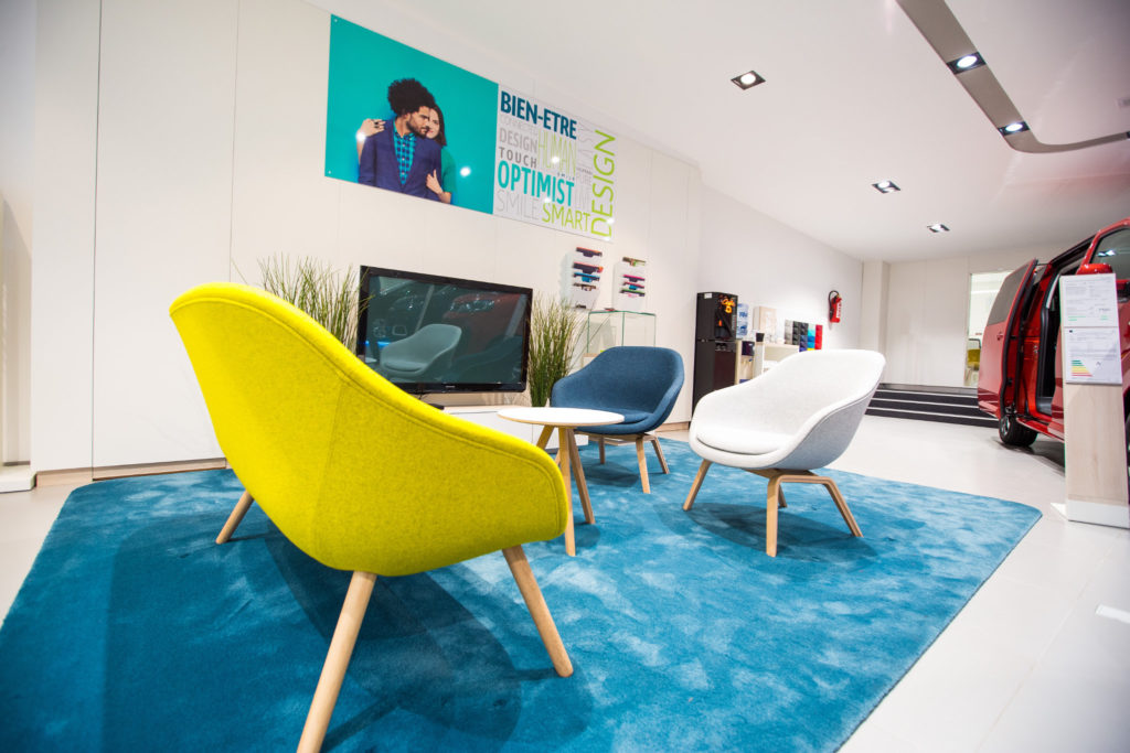 Die Raumgestaltung wird durch Bistrotheken erweitert, die als „After-Sales-Wartebereiche“ dienen. Glaswände mit mehrfarbigen Textapplikationen sorgen für eine aufgelockerte und freundliche Atmosphäre. Farbige Musterwände mit Fahrzeuglacktafeln sowie freistehende Prospektwände mit einhängbaren Ablagen setzen weitere Farbakzente und unterstützen die Kundenorientierung im Verkaufsraum.