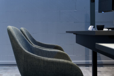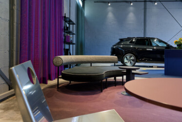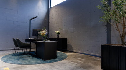 Das Gesamtkonzept basiert auf der Umsetzung der gegebene Hallen- & Raumstruktur in ein urbanes Industriedesign mit teils rohen, unbehandelten Oberflächen und der gelungenen Adaption von „stylischen“ Möbelelementen und teils stark kontrastierenden Materialien sowie Farbgebung. Die loftartige – autohausuntypische – Wohnlichkeit wird durch farbige raumhohe, semitransparente und luftige Vorhänge erzielt.