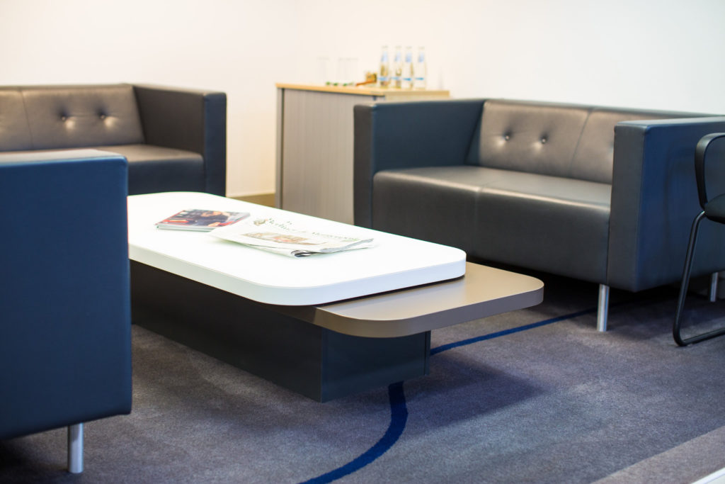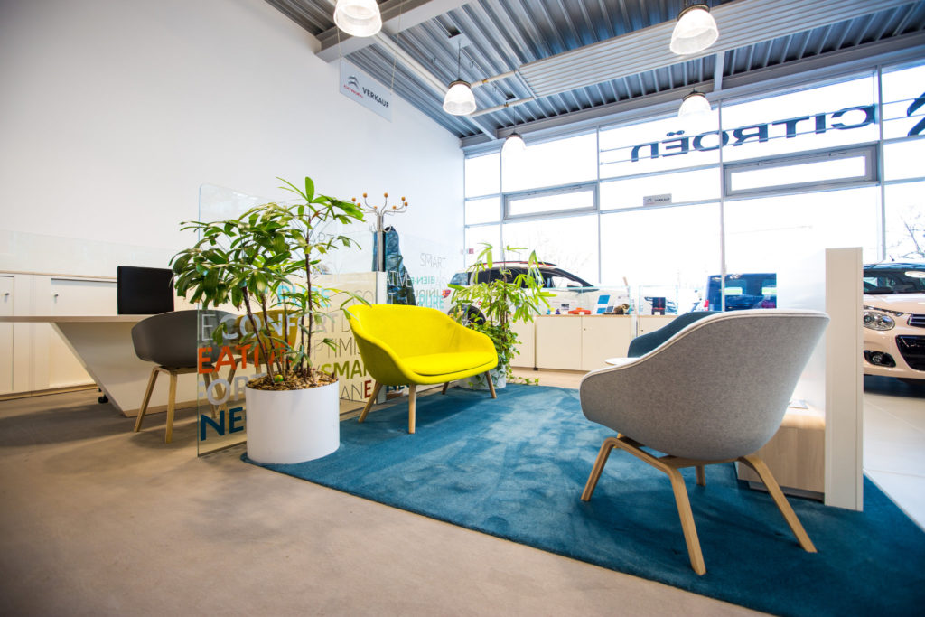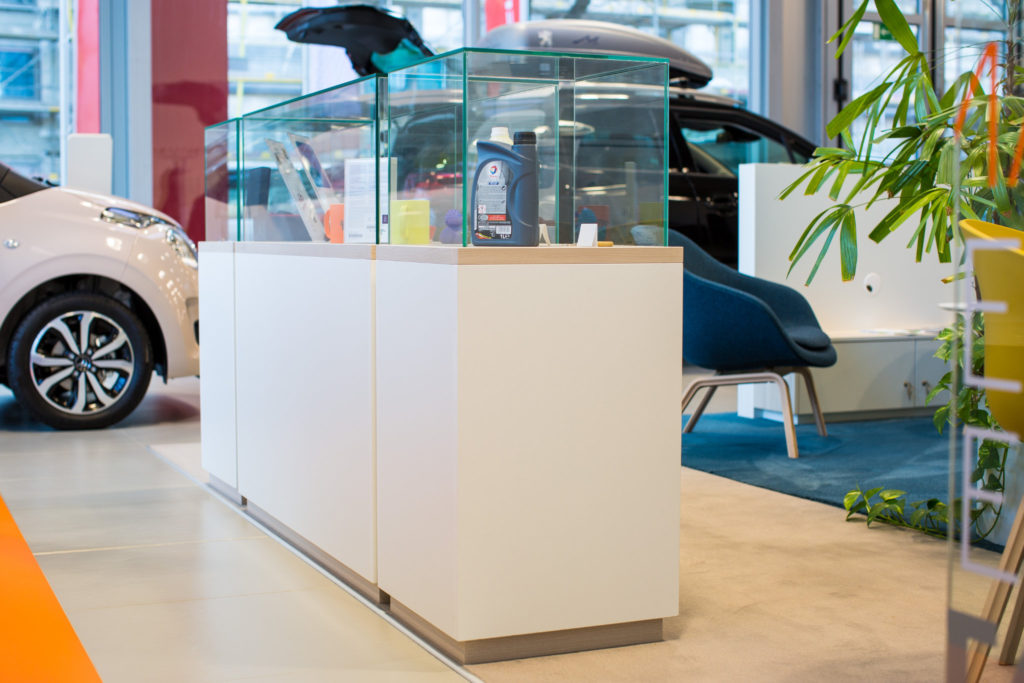 Die Niederlassungen sind zudem mit Wohlfühlzonen ausgestattet, die moderne Couchmöbel für die Endkundinnen und -kunden bieten. Ergänzt werden diese durch Wartebereiche und Besprechungsräume mit klassischen Schwingstühlen. Glaswände mit Teilmattierungen sowie freistehende Prospektwände mit einhängbaren Ablagen gehören ebenfalls zur Ausstattung. Varianten mit Sonderhaltern für Zubehörteile sind ebenfalls verfügbar. Ein markantes Shop-Highlight bildet die Markenwand mit erhabenem PEUGEOT-Chromlogo.