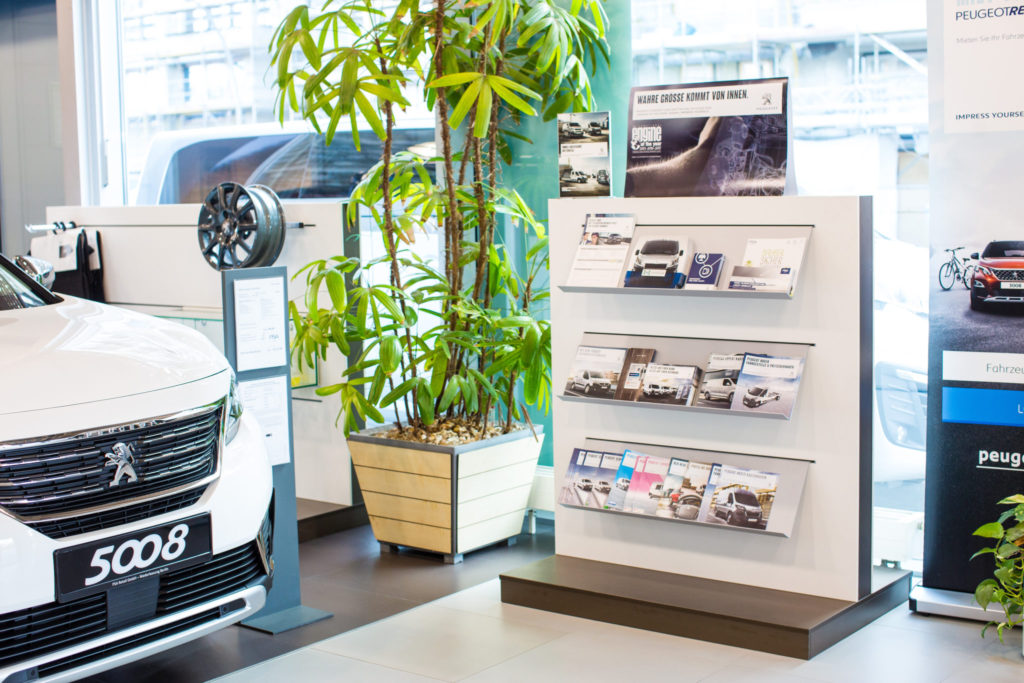 Zum Portfolio der Peugeot Shopmöblierung gehören von mann Objecta installierte Empfangstheken und Verkäuferarbeitsplätze, hohe Konfigurationstische sowie schlanke Preisaufsteller mit anthrazitfarbenen Metallfüßen. Vitrinenunterschränke werden in zahlreichen optimierten Varianten geliefert. Besondere Aufmerksamkeit gilt den großen Fahrzeugpodesten mit integrierter LED-Beleuchtung, die die ausgestellten Fahrzeuge im Showroom wirkungsvoll in Szene setzen.