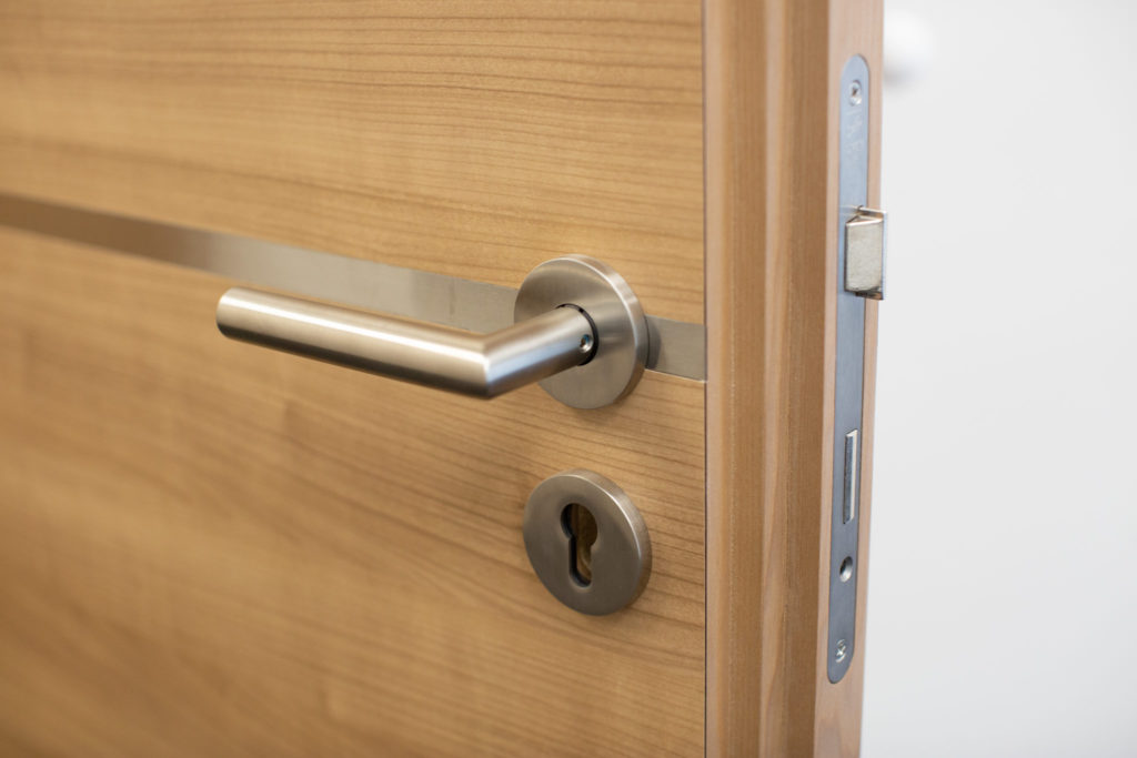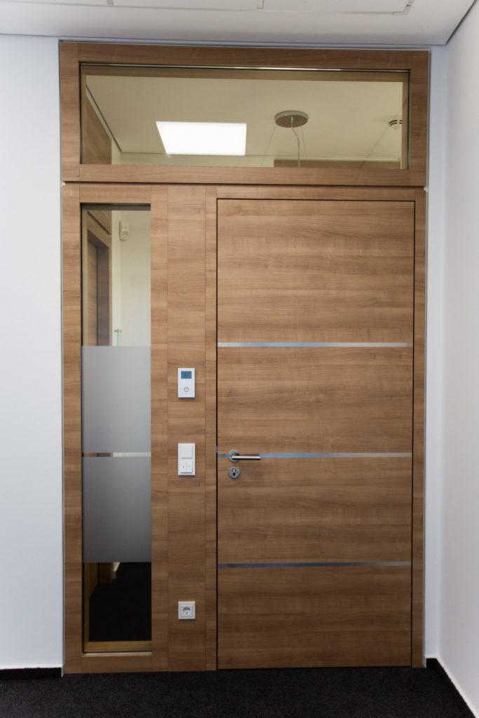 Für die Volksbank Rhede eG wurden Blockzargen mit seitlichen, teilmattierten Glaselementen und aufgesetzten Oberlichtern eingesetzt. Die Blockzarge ermöglicht einen flächenbündigen Übergang der Türblätter zu den Wandbekleidungen und besteht aus einem massiven Rahmenprofil. Die Oberflächen der Türen und Zargen sind mit Schichtstoff im Dekor „Kirschbaum Verona“ des Herstellers Egger gestaltet. Der horizontal verlaufende Furnierverlauf harmoniert mit den drei quer verlaufenden, in edler Metalloptik ausgeführten Leisten auf den Türfronten.