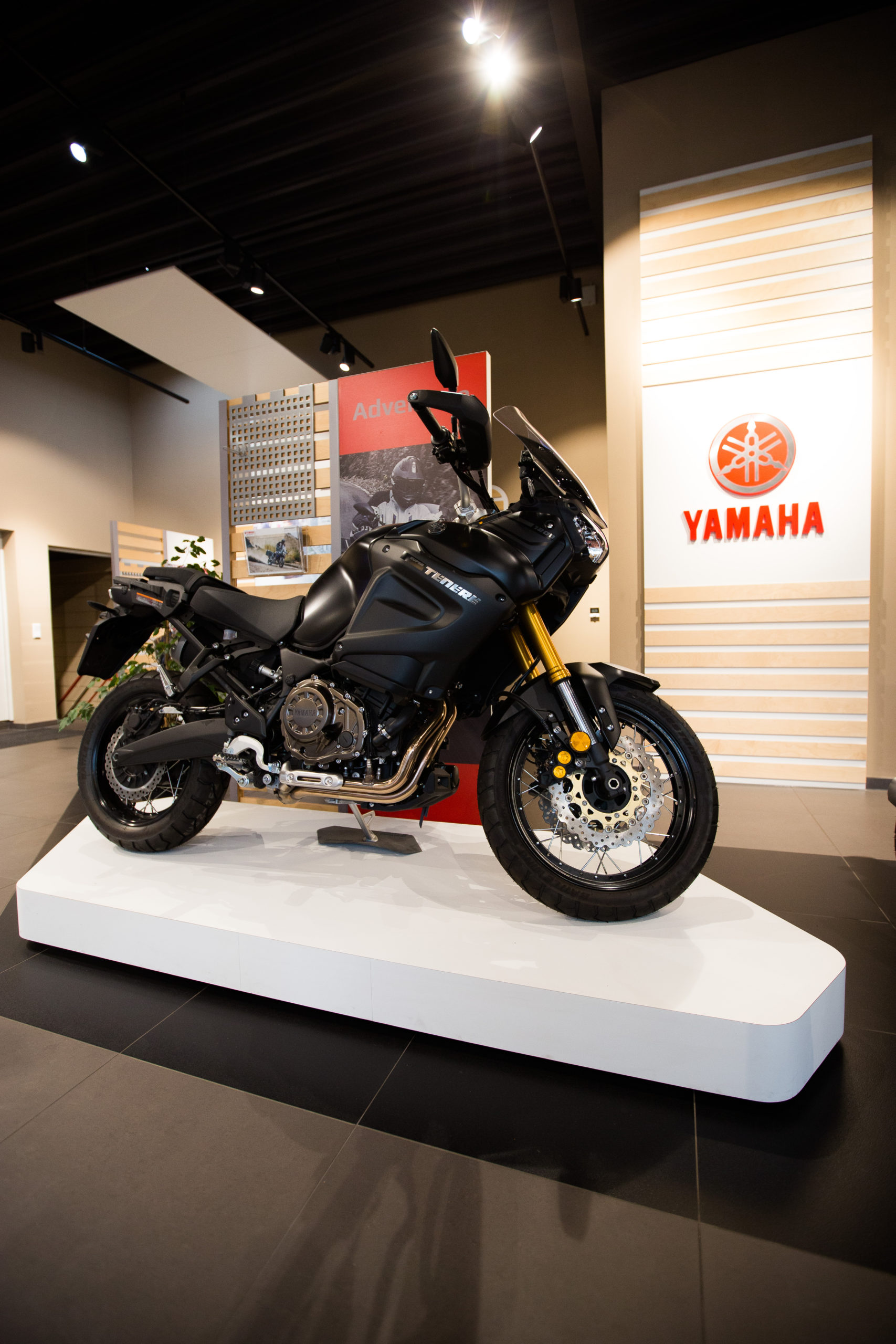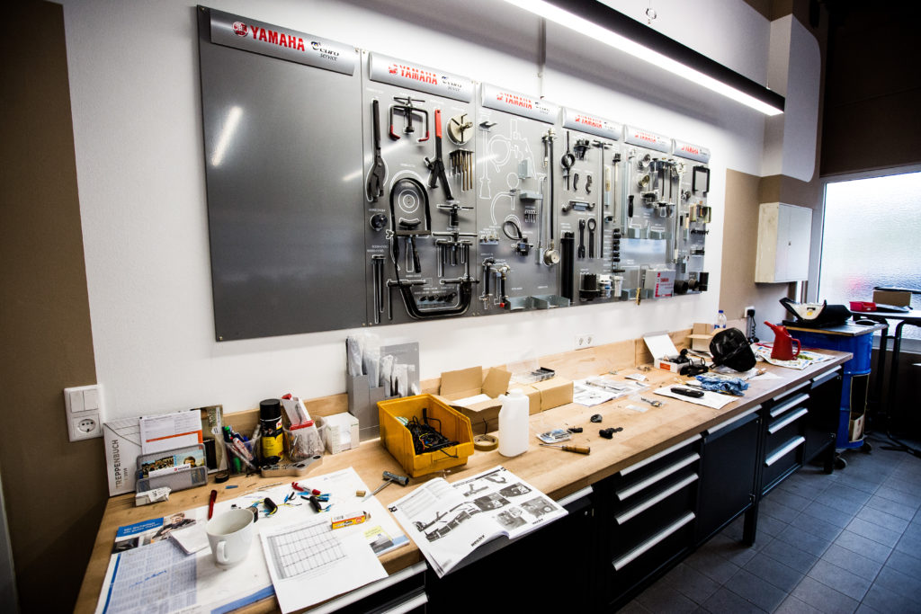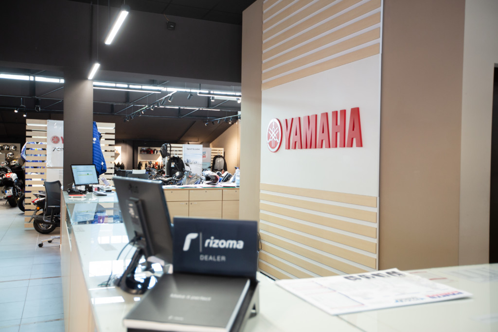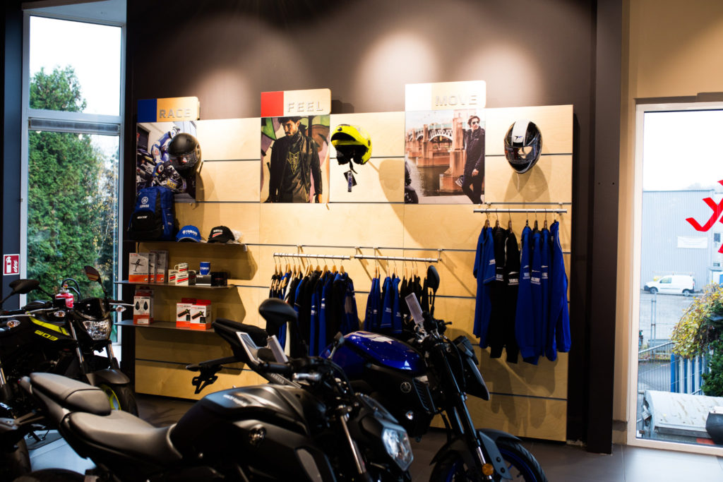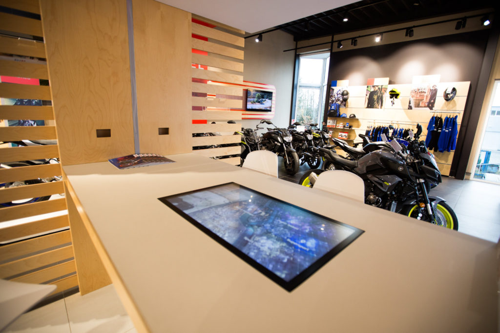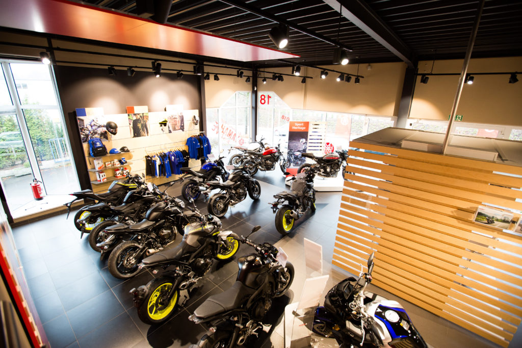 Die Einrichtung eines YAMAHA Bike Shops stellt komplexe Anforderungen, die mann Objecta zu einem stimmigen Gesamtkonzept verbindet. Ziel ist eine einladende Raumgestaltung, die Produkte und Accessoires optimal in Szene setzt. Die installierte Lichttechnik spielt dabei eine zentrale Rolle: Flexible, schwenkbare LED-Strahler auf Stromschienen sorgen für eine gezielte Beleuchtung, damit Kundinnen und Kunden die Motorräder und Zubehörartikel klar und detailreich wahrnehmen können. Dunkle Deckenfarben unterstützen die Fokussierung auf die Produkte. Die Ladenräume verzichten auf verspielte Elemente und konzentrieren sich auf das Wesentliche, passend zur Zielgruppe. Die etwa 175 Quadratmeter großen Bodenflächen sind mit dezenten, großformatigen, anthrazitfarbenen Belägen ausgestattet. Die sandfarbenen Wände tragen großflächige Holzpaneele mit abgesetzten Farbakzenten, Streifenmustern oder integrierten LED-Bildschirmen.